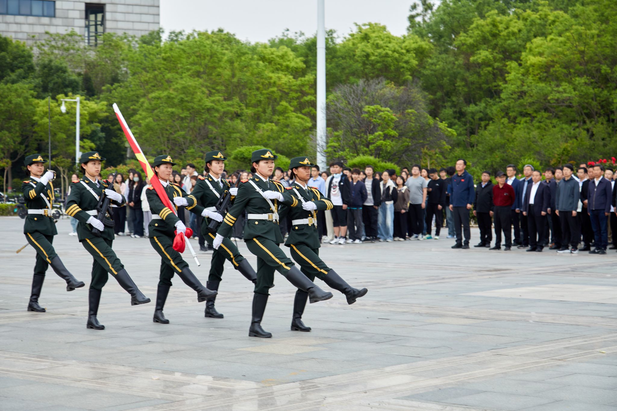 仪式开始,国旗护卫队以军姿列阵,队员们踏着刚健有力的正步,护送五星红旗至旗台进行升旗。随着《义勇军进行曲》雄浑的旋律响起,升旗手振臂扬旗,全体师生保持立正姿态行注目礼,目送鲜艳的国旗冉冉升起。